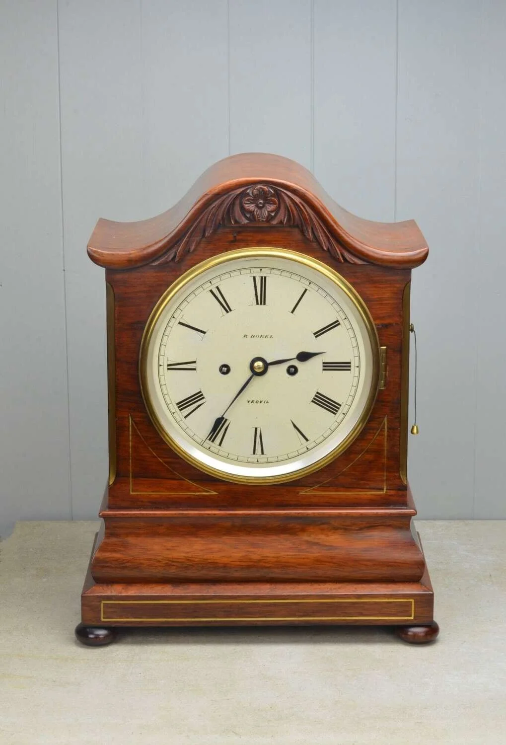 William IV period rosewood bracket-clock. The eight-day striking movement with a painted dial signed R dobel Yeovil. In a serpentine-topped case with a carved leaf and scrollwork decoration and brass line inlay and sound-frets. The high quality two train fusee movement, with pull repeat, strikes the hours and half hours on a bell.